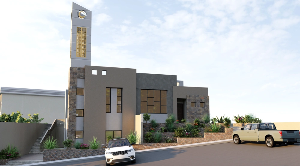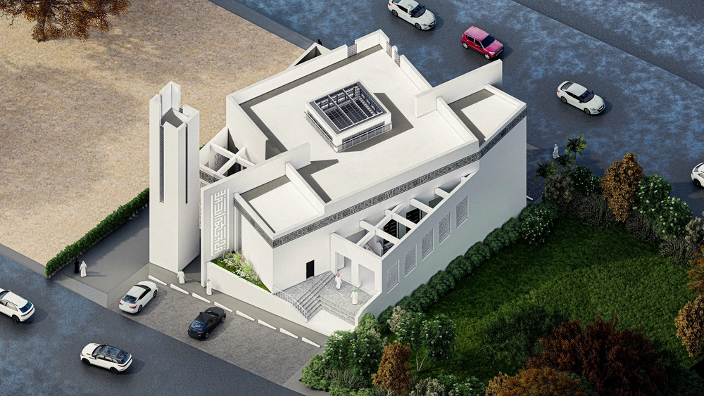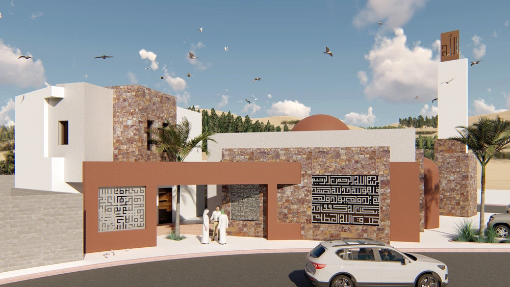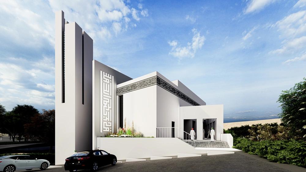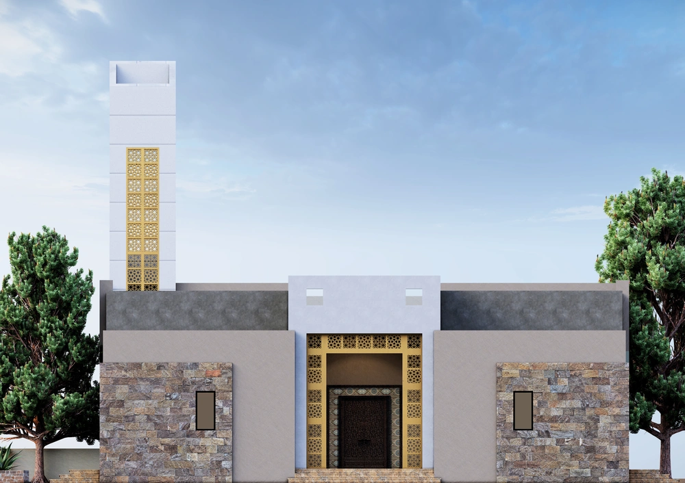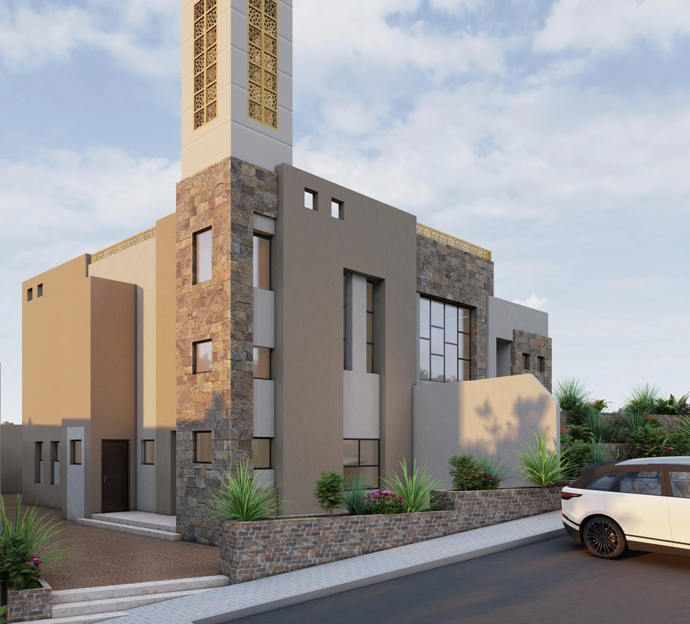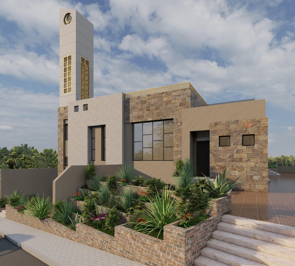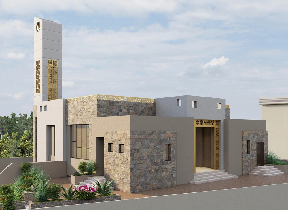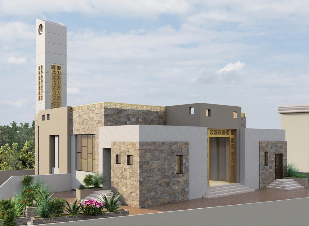 A modernly designed mosque on a 640 m2 plot of land, consisting of three floors: a ground floor (men’s prayer hall and services) and two basement levels (residential quarters for the imam, muezzin, and guard, and educational halls). The design takes into account the balance in the composition of the masses and the use of visually pleasing Islamic colors and decorations that reflect simplicity in the composition.