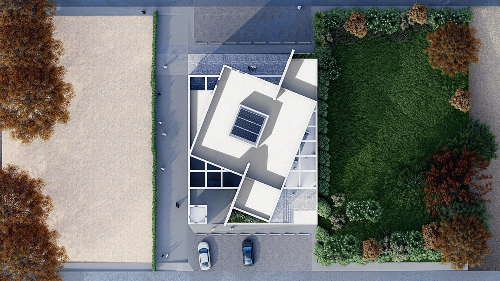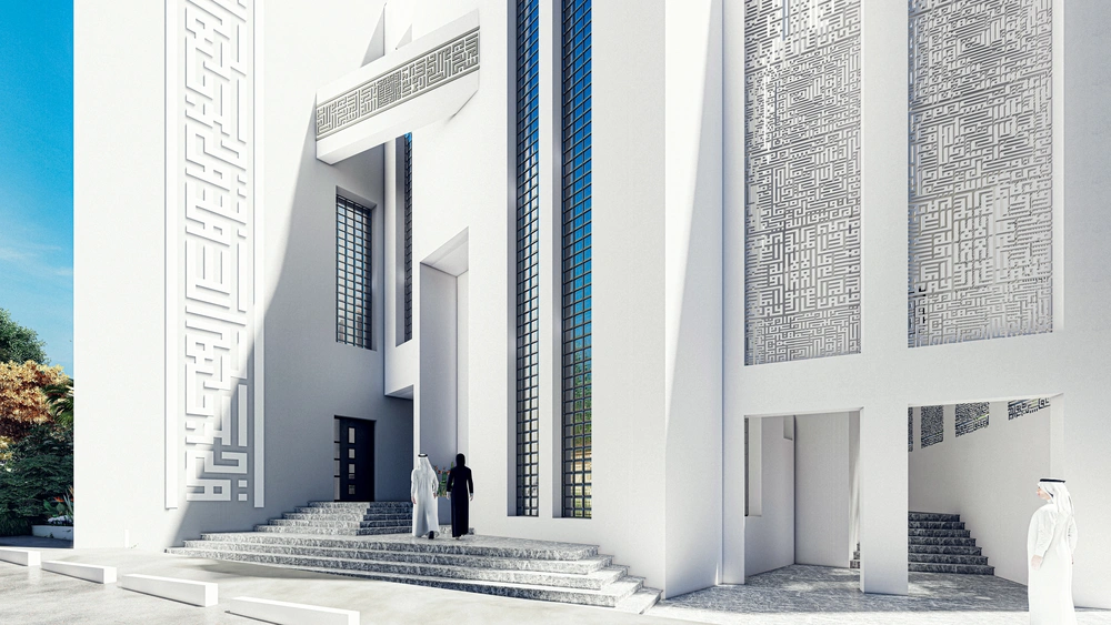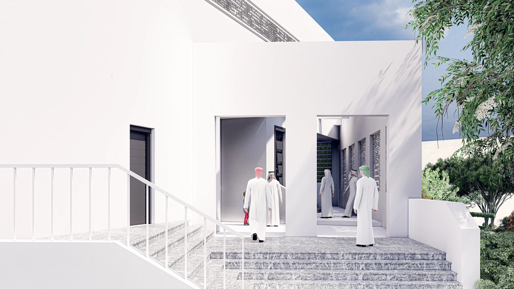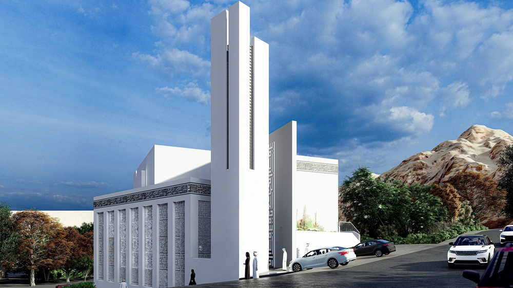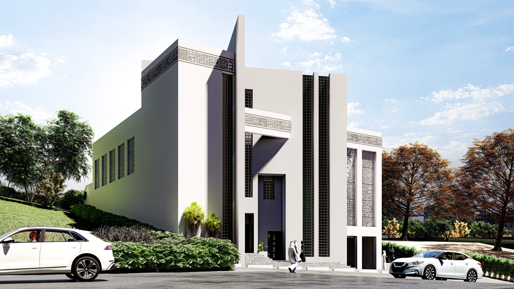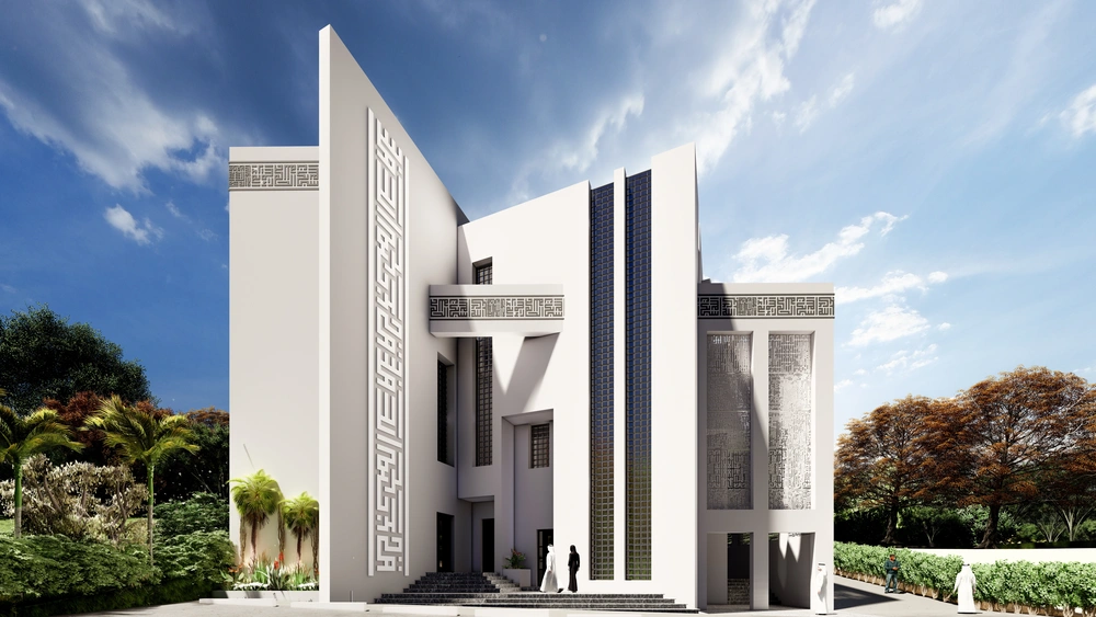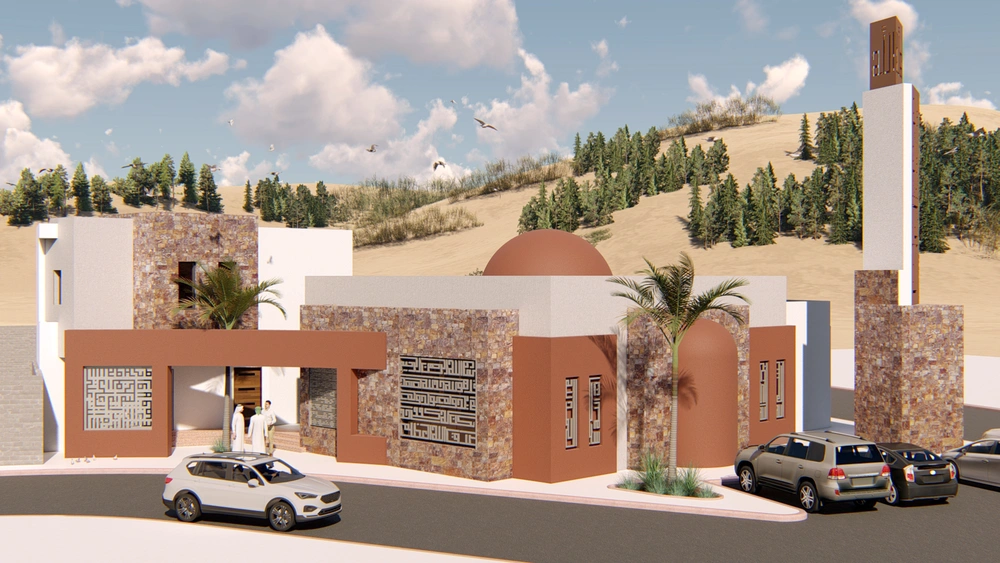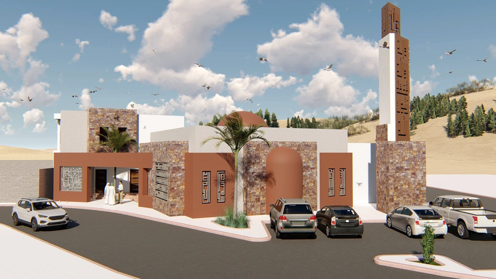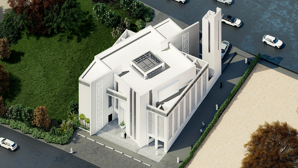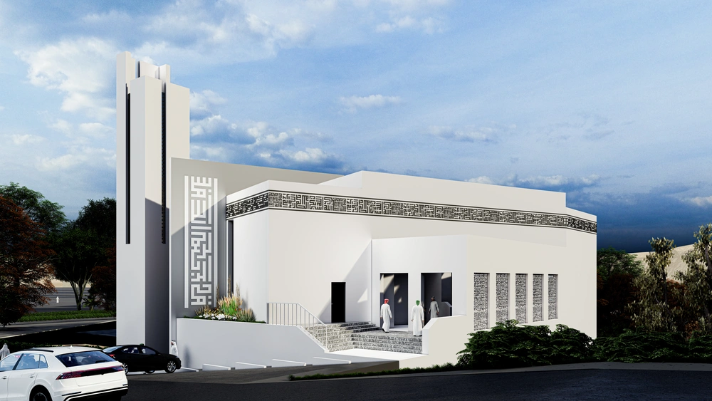 A modernly designed mosque on a 640 m2 plot of land, consisting of three floors: a ground floor (men’s prayer hall and services) and two basement levels (residential quarters for the imam, muezzin, and guard, and educational halls). The design takes into account the balance in the composition of the masses and the use of visually pleasing Islamic colors and decorations that reflect simplicity in the composition.