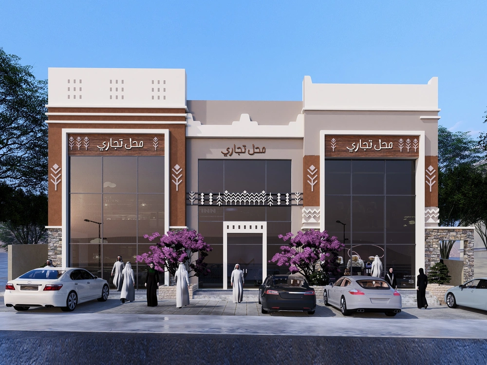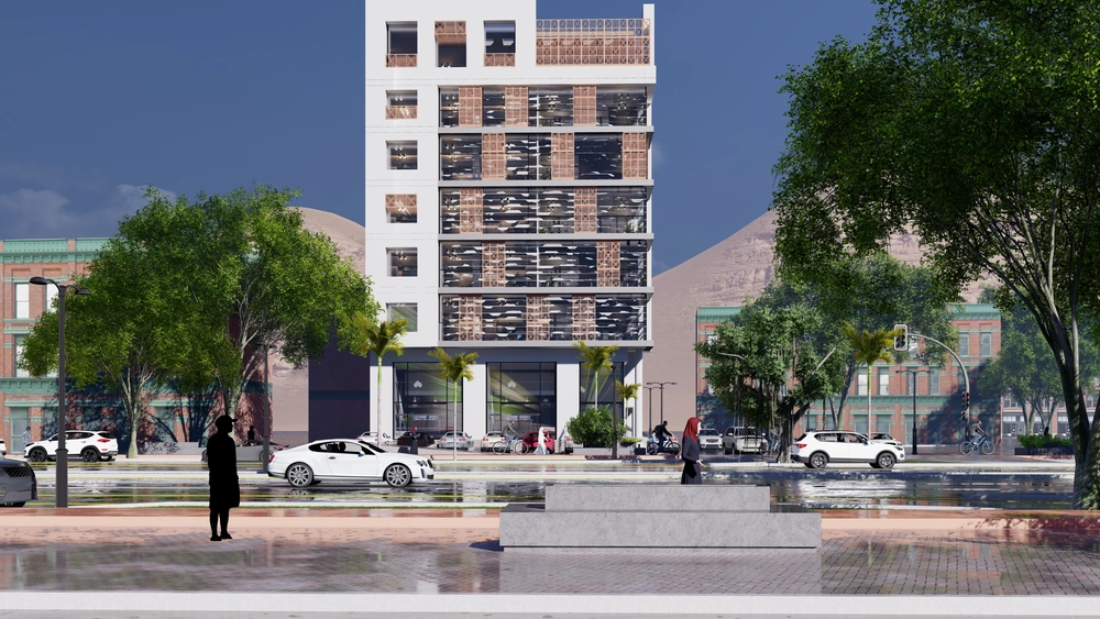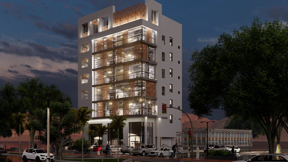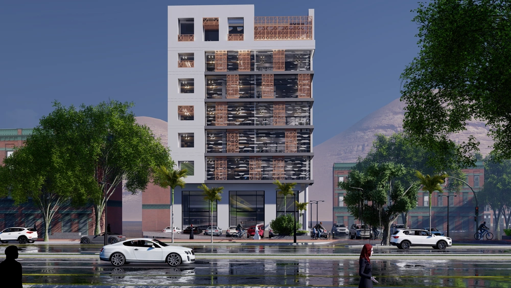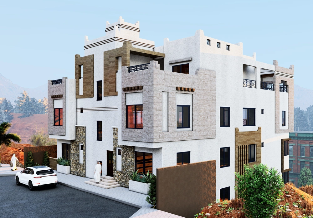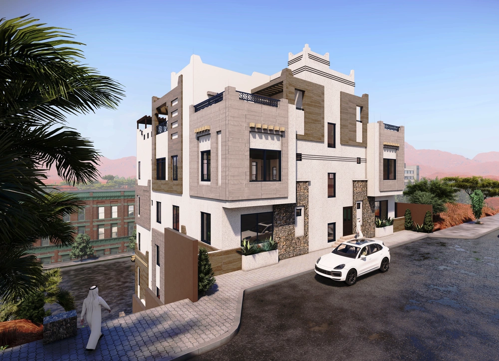 Design of a commercial administrative building on a land area of 460m2 consisting of a basement, ground floor, 5 upper floors and an upper annex with a contemporary architectural design stemming from the urban identity of the Asir region.