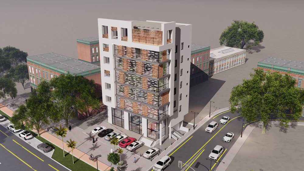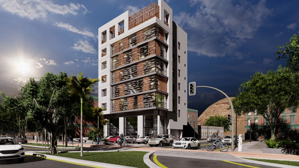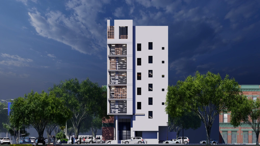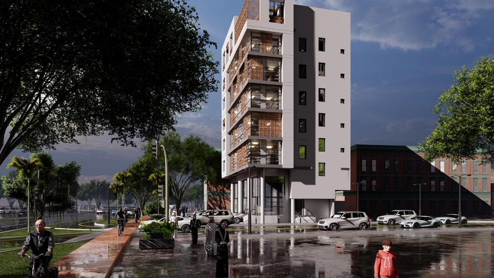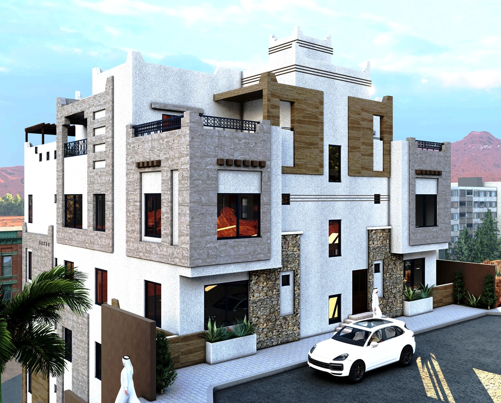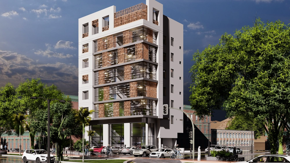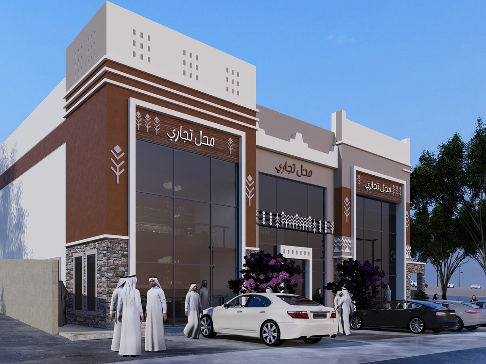 Design of a commercial administrative building on a land area of 460m2 consisting of a basement, ground floor, 5 upper floors and an upper annex with a contemporary architectural design stemming from the urban identity of the Asir region.
