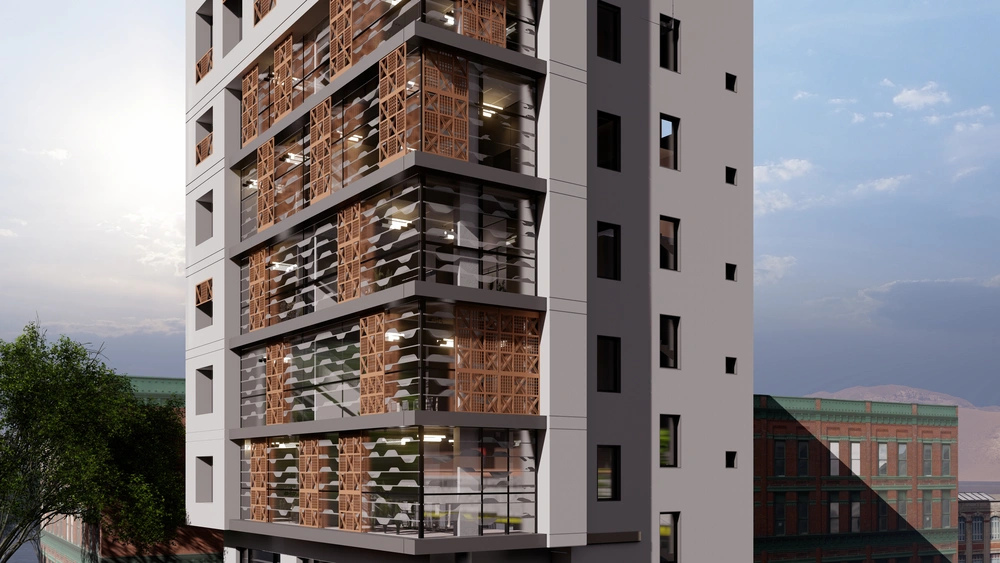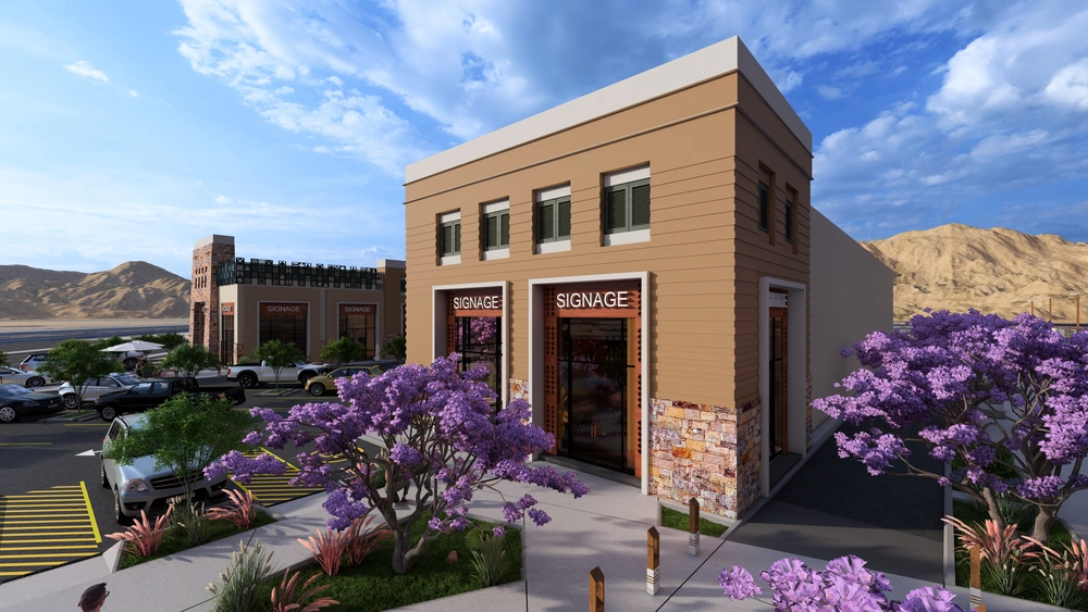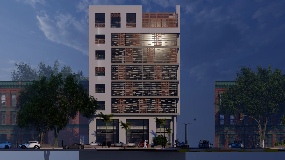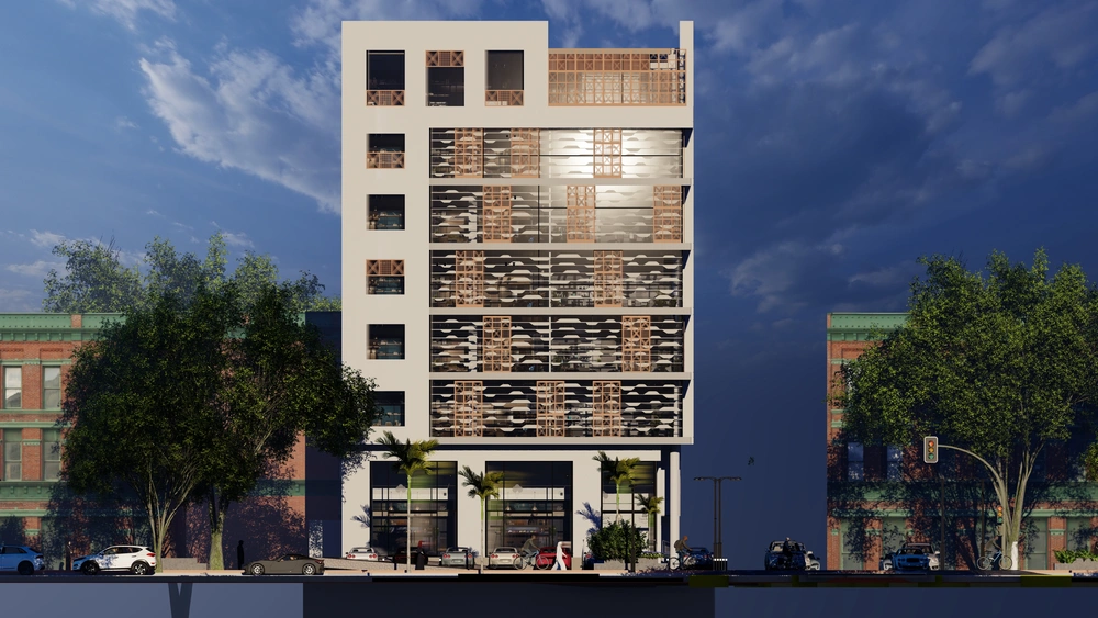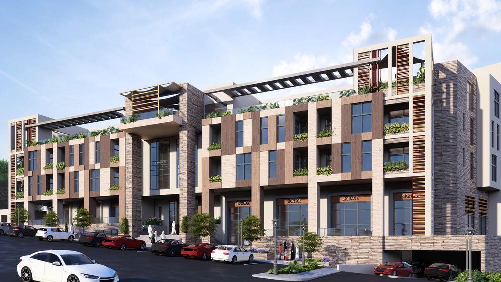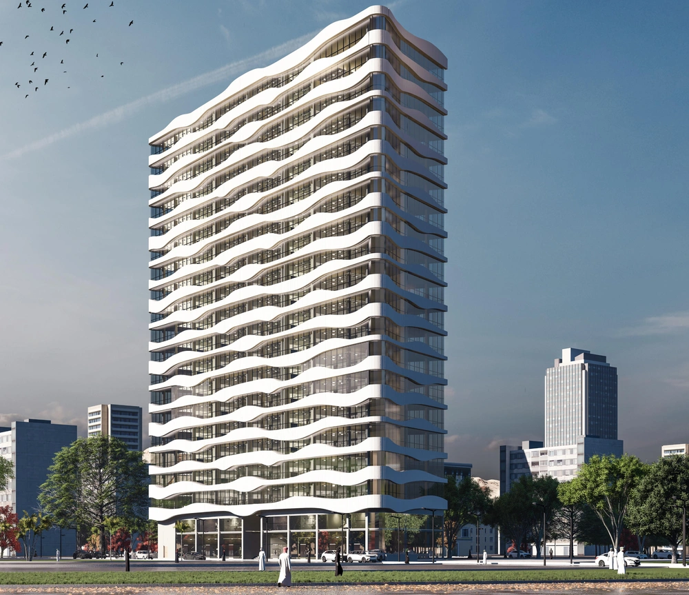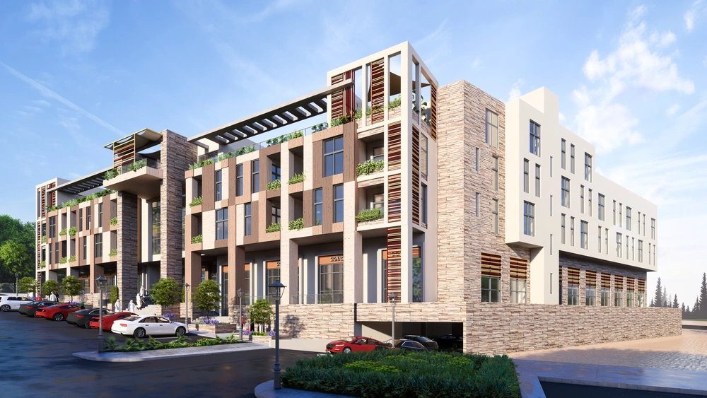 Design of a commercial administrative building on a land area of 460m2 consisting of a basement, ground floor, 5 upper floors and an upper annex with a contemporary architectural design stemming from the urban identity of the Asir region.