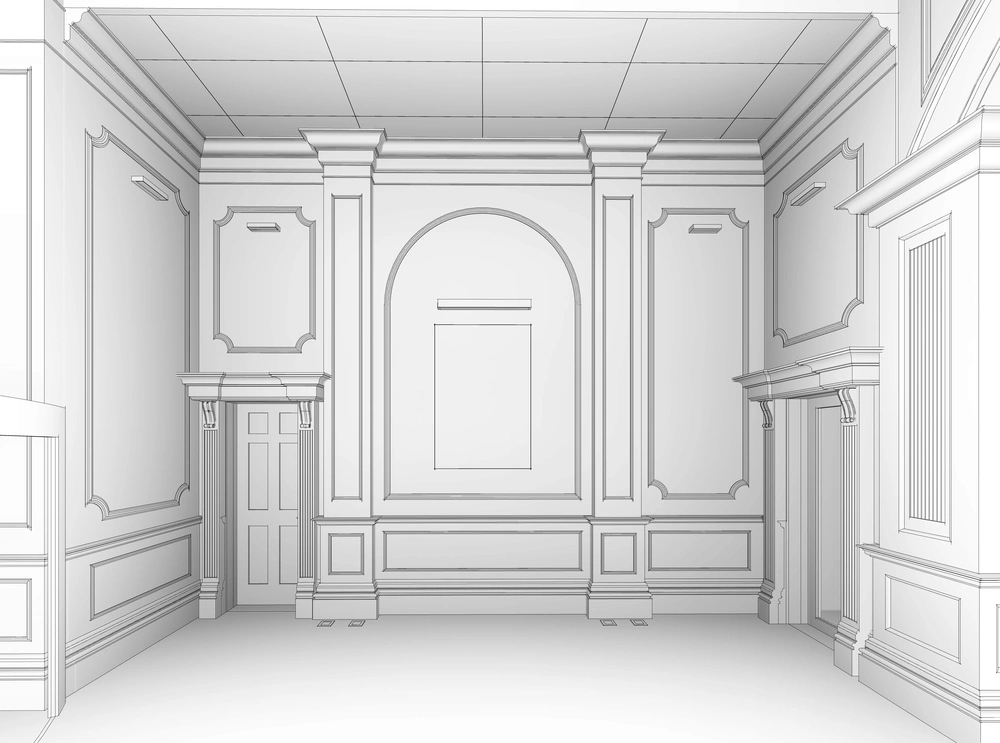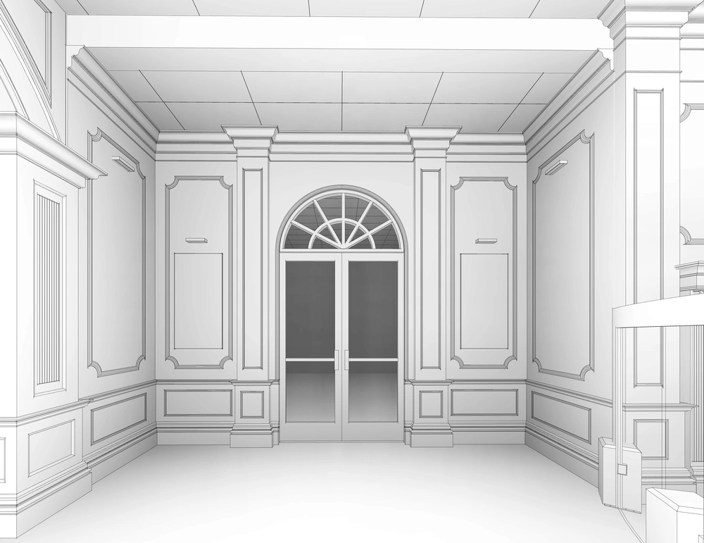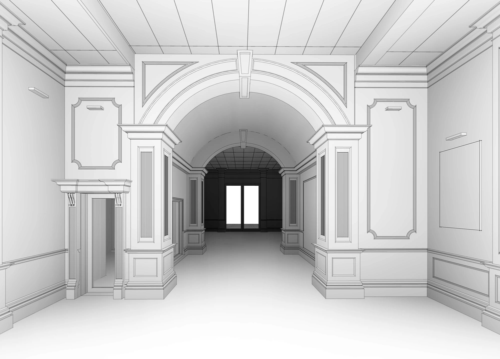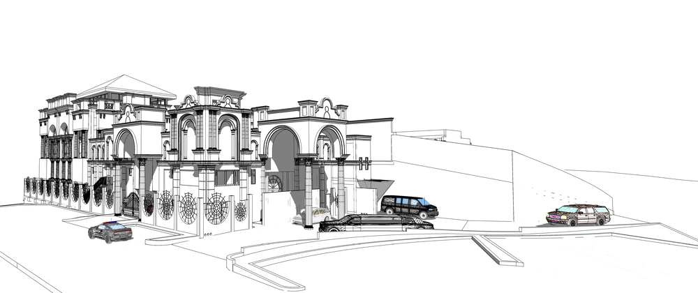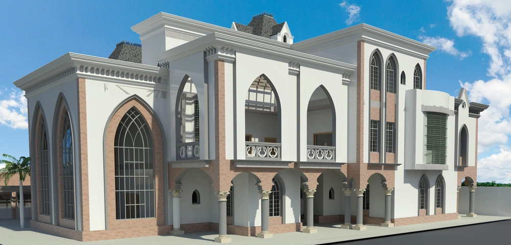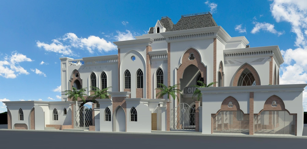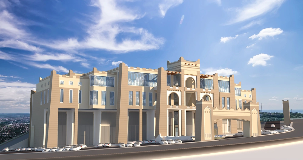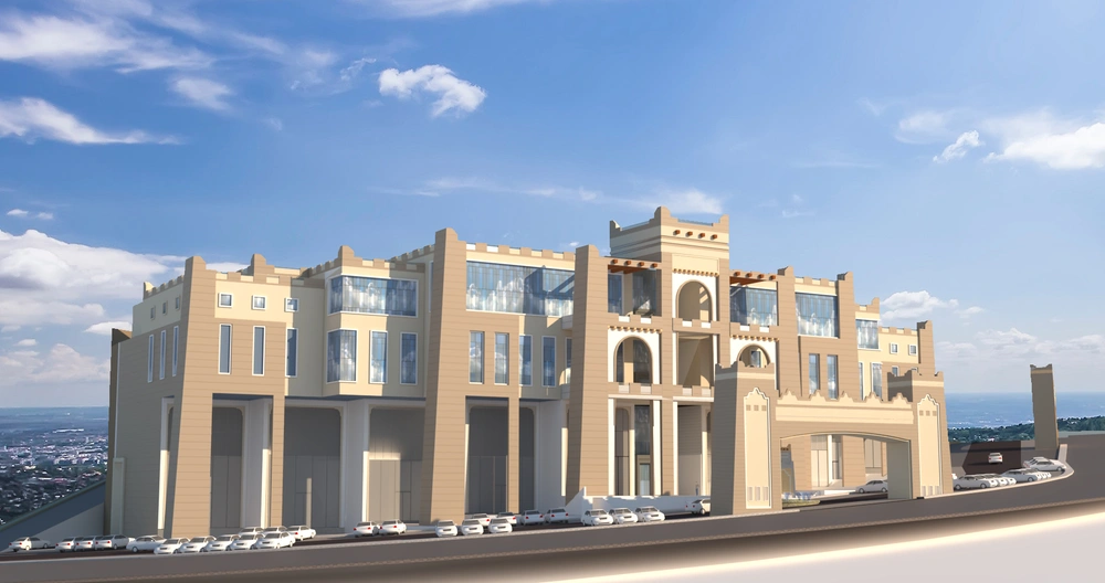 An investment hall project on a 2920 m² plot, comprising three floors: the ground floor (women’s majlis, banquet hall, ladies’ dining hall, and all ancillary services); the mezzanine (bridal suite, photography studio, sleeping quarters, and ancillary services); and the first floor (men’s majlis, dining hall, central kitchen, and all ancillary services).