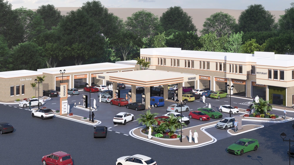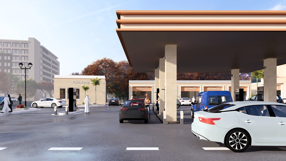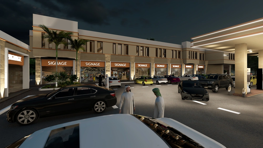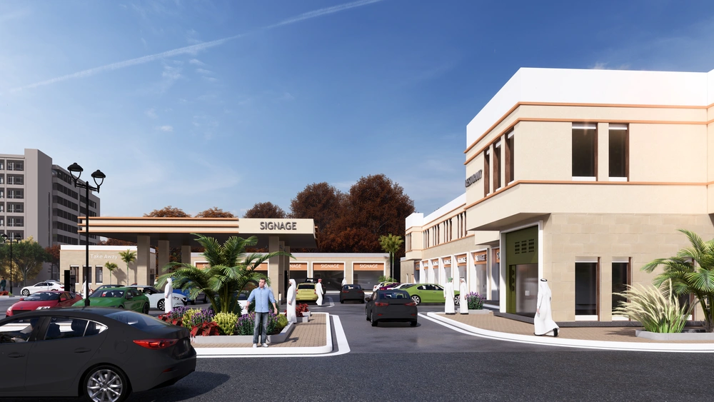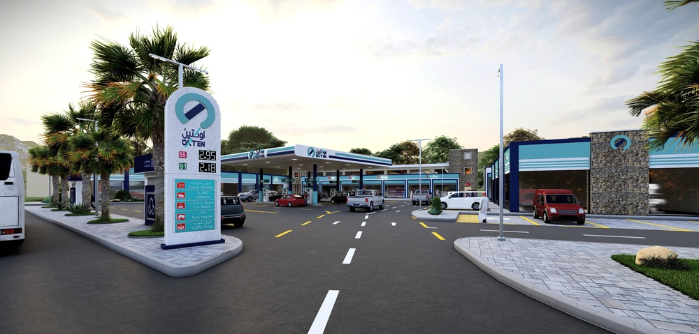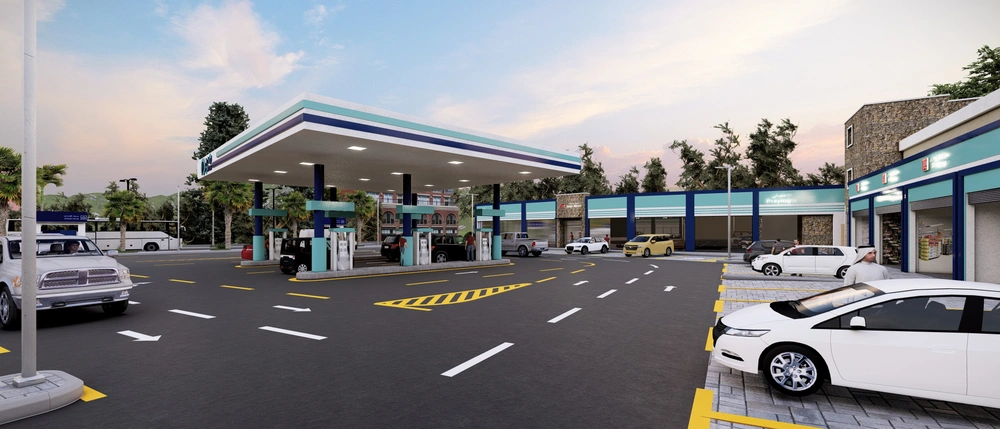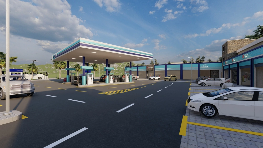 A Class (B) fuel station on a land area of 5143 m2, including petroleum services, car services, shops, individual accommodation, a Drive Thru location, a prayer room and an ATM. The station was designed according to the identity of the operating company with the addition of some local elements and finishing materials to give a distinctive local character to the building blocks.