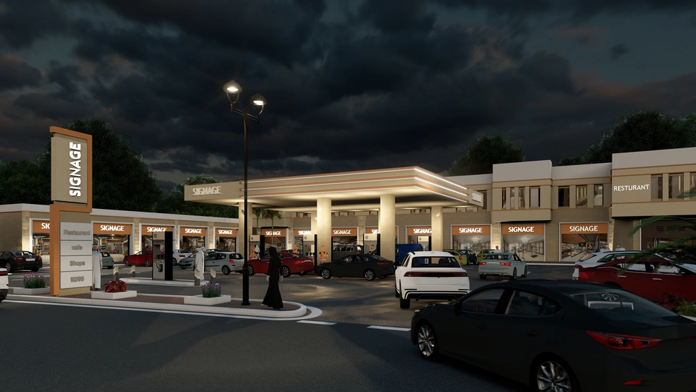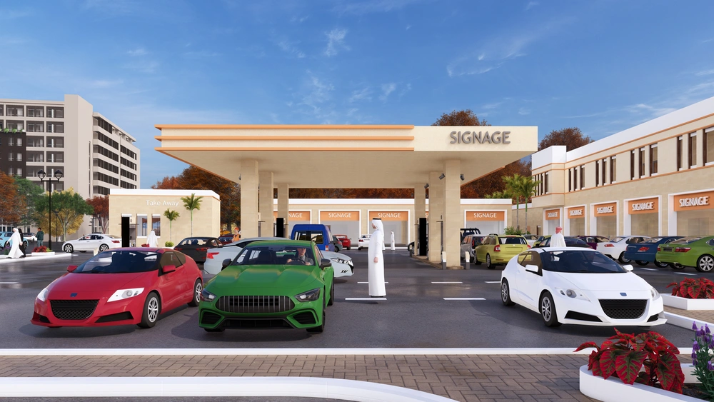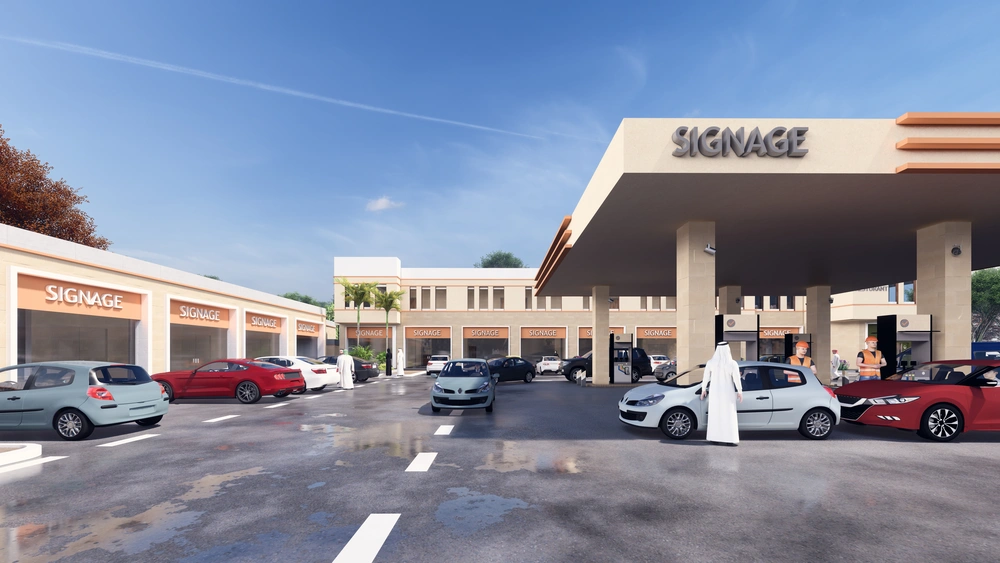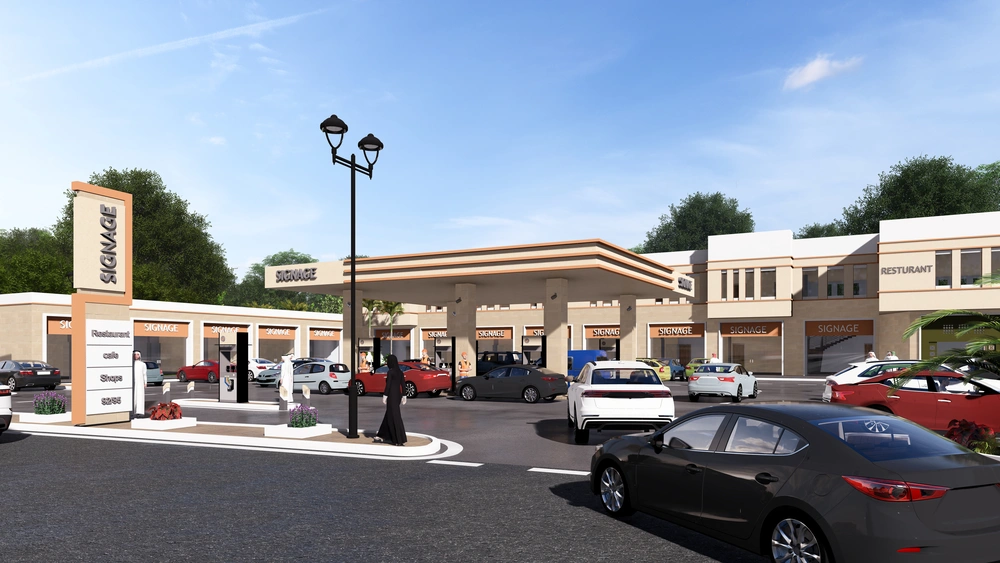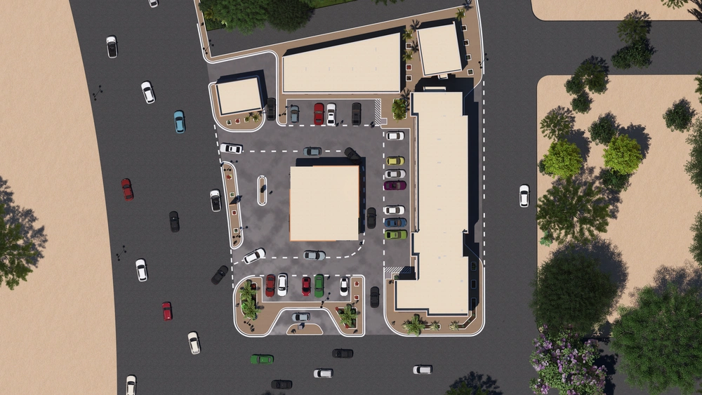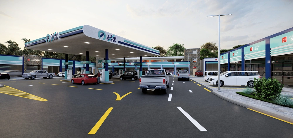 A Class (B) fuel station on a land area of 5143 m2, including petroleum services, car services, shops, individual accommodation, a Drive Thru location, a prayer room and an ATM. The station was designed according to the identity of the operating company with the addition of some local elements and finishing materials to give a distinctive local character to the building blocks.