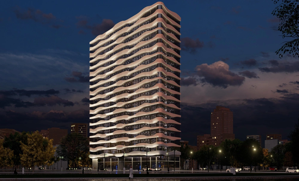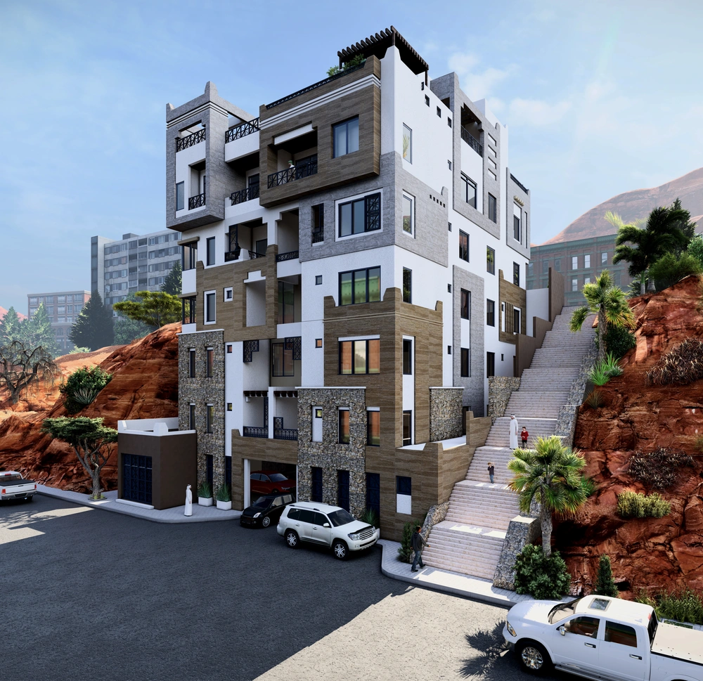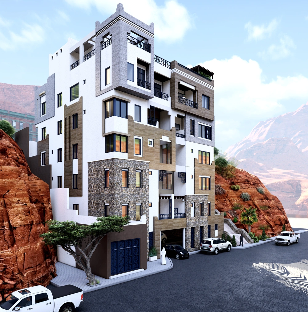 A hotel on a 650 m2 plot of land consisting of a basement (parking and services), a ground floor (shops), and four repeated floors (hotel suites). The building features a simple facade design derived from the architectural vocabulary of the Asir region and an interior design that meets the needs of tourists.