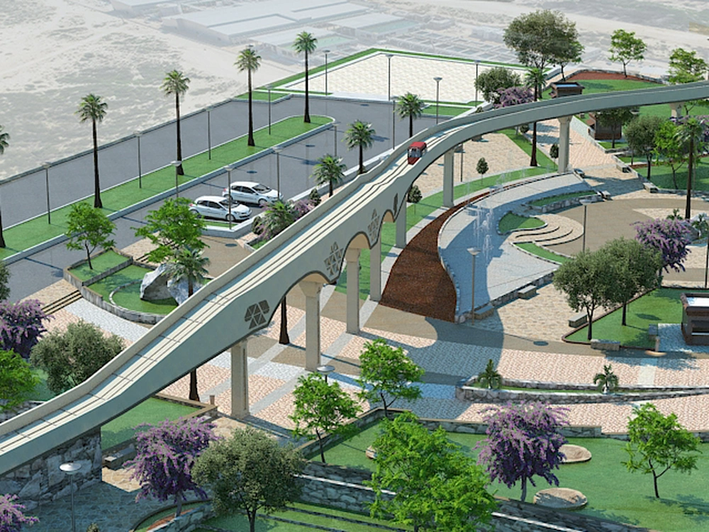 The project falls under the urban landscape improvement plan of the Asir Region Municipality. The site is a distinctive park spanning 66,000 square meters north of Tanomah city. It features a natural waterfall atop the mountain range behind the park. The park comprises two sections separated by a wadi (valley) course. The design incorporates a main path connecting the two sections, culminating in a central plaza overlooking the waterfall. The design also includes seating areas, service facilities, and recreational spaces.