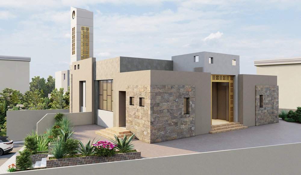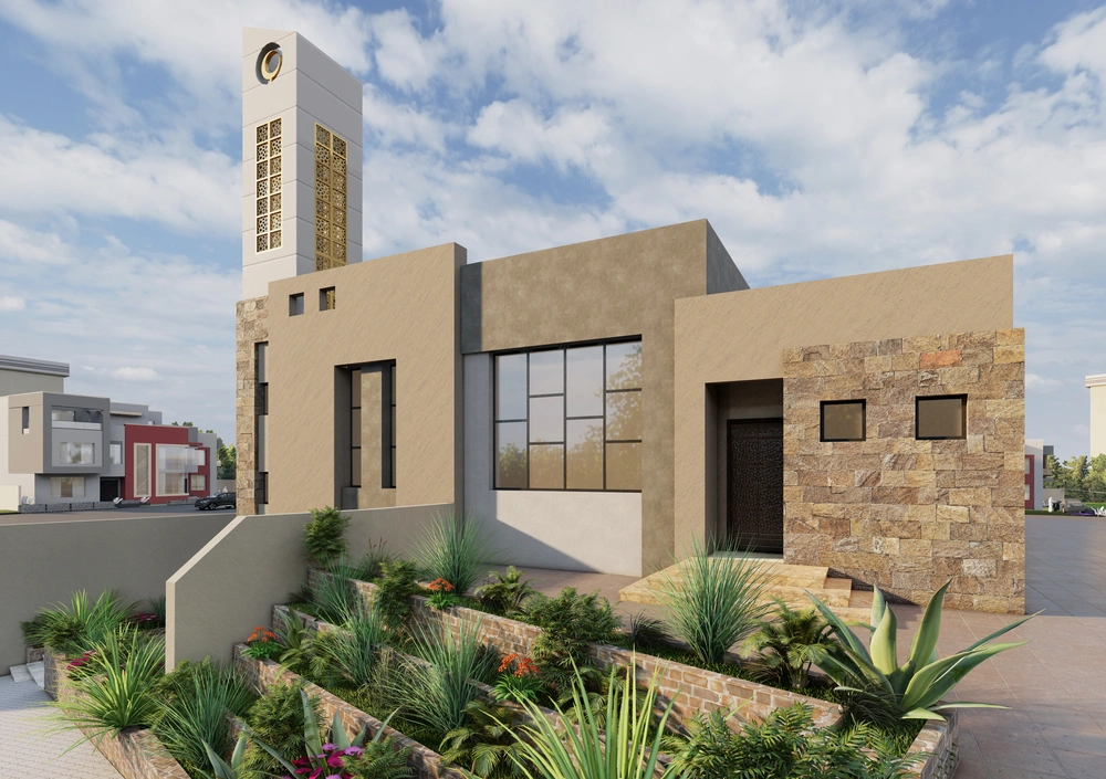 A modernly designed mosque on a 256 m2 plot of land, consisting of a ground floor (men’s prayer hall and services) and a basement (women’s prayer hall with services). The design takes into account the balance in the composition of the masses and the use of colors and materials that complement the local environment of the area and its surroundings.