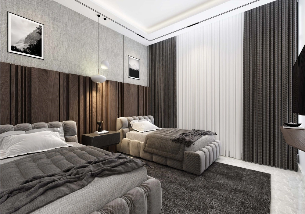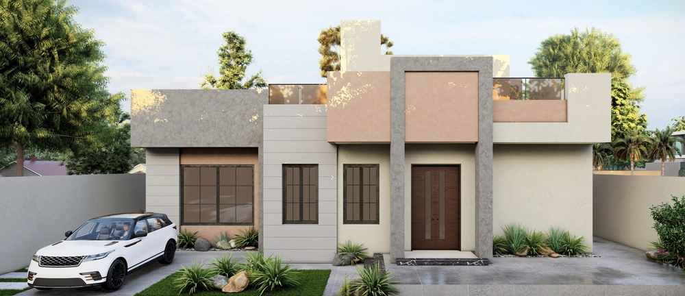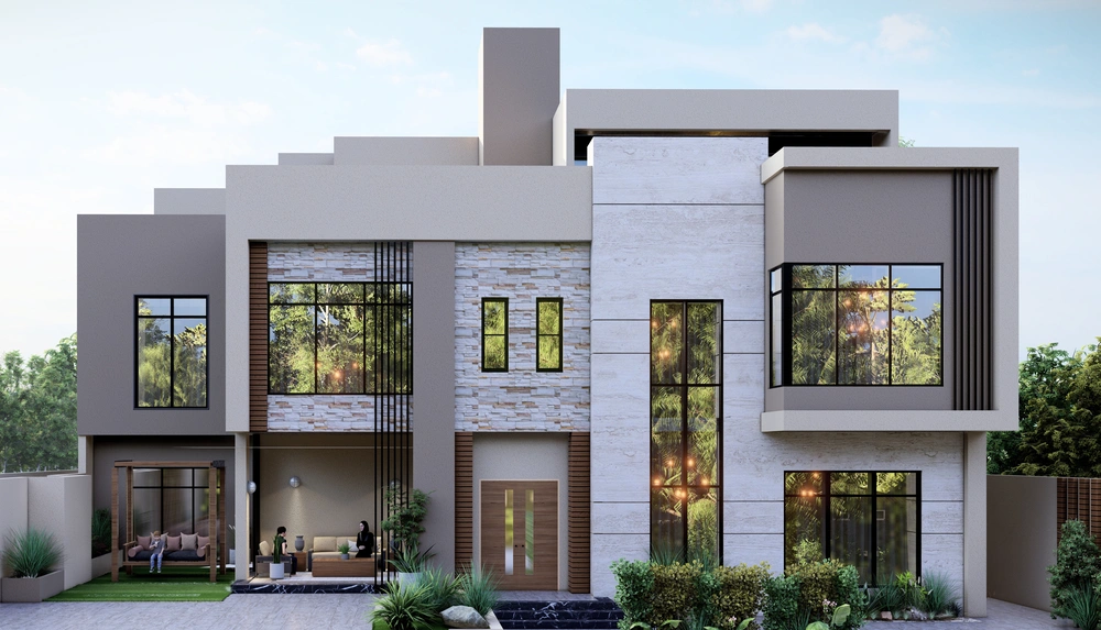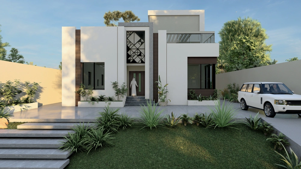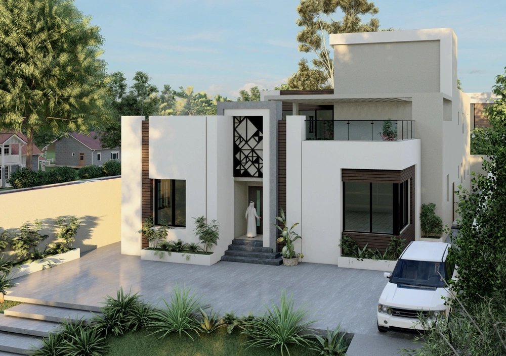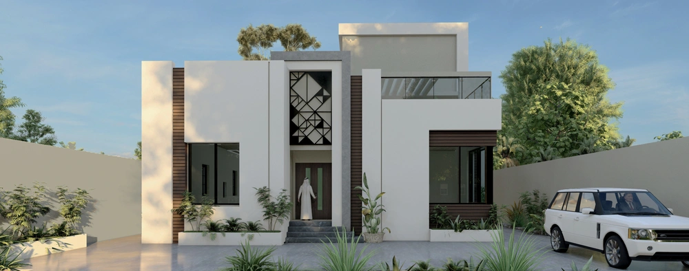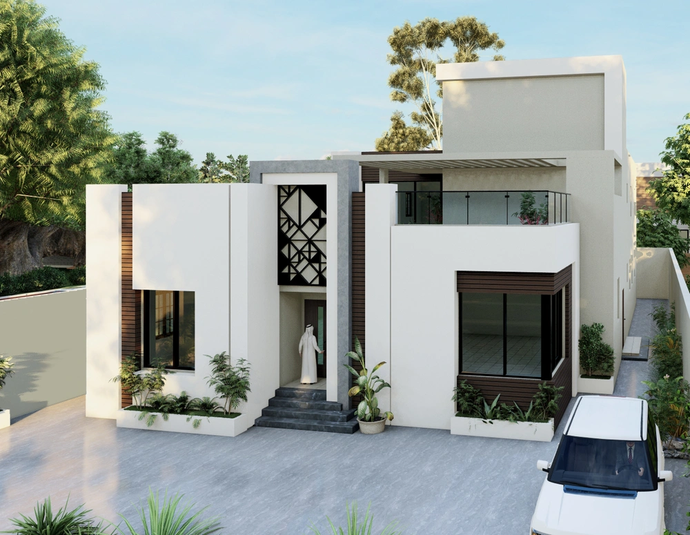 A residential villa project on a land area of 600 m2 consisting of two floors and an upper annex. The contemporary design is characterized by relatively large openings overlooking the front setback of the street, the variety in the projection of the facade blocks, and the use of simple finishing materials.