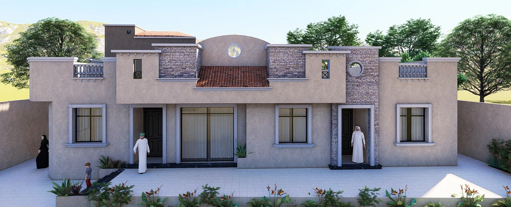 A contemporary-style villa consisting of two floors and a rooftop annex, located within agricultural land and directly overlooking Wadi Abha.